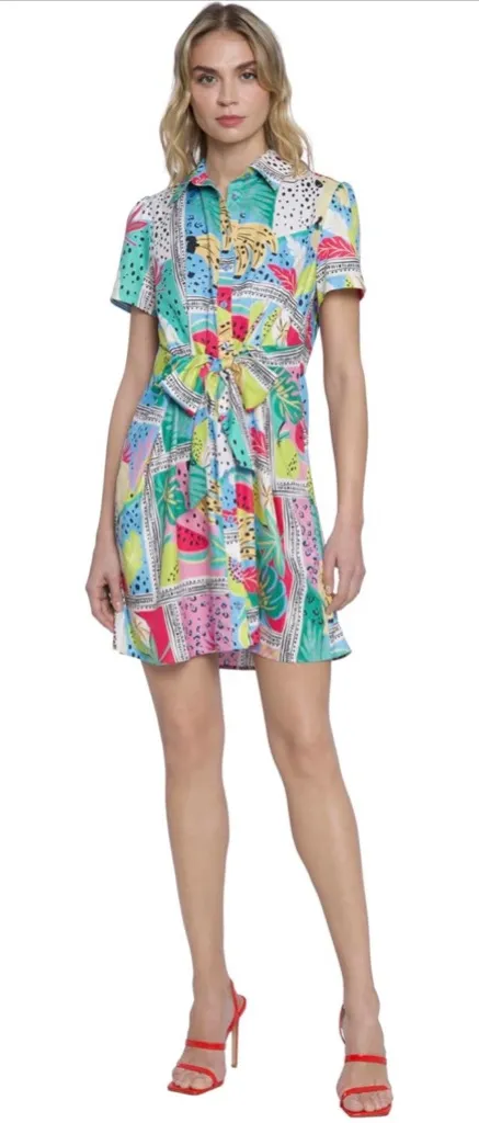 Fabric type 100% Polyester Care instructions Machine Wash Origin Imported Closure type Button About this item This collared button front shirt dress features short sleeves, a front waist tie, and stretchy elastic at the back waist. The mini skirt showcases a funky tropical print, making it a perfect summer dress. This casual dress is versatile and can be worn for various occasions. It's a great choice for a baby shower, bachelorette party, or bridal shower, adding a touch of tropical flair to your event. The dress is unlined, providing a lightweight and comfortable fit. It features button closures at the front bodice for easy wear. Please note, this dress does not have pockets. Printed Twill: 100% Polyester Recommended Care: Turn Inside Out, Machine wash cold with similar colors Gentle cycle Only non-chlorine bleach when needed Reshape, lay flat to dry Warm iron as needed Dry clean Description This collared button front shirt dress features short sleeves, a front waist tie, and stretchy elastic at the back waist. The mini skirt showcases a funky tropical print, making it a perfect summer dress.