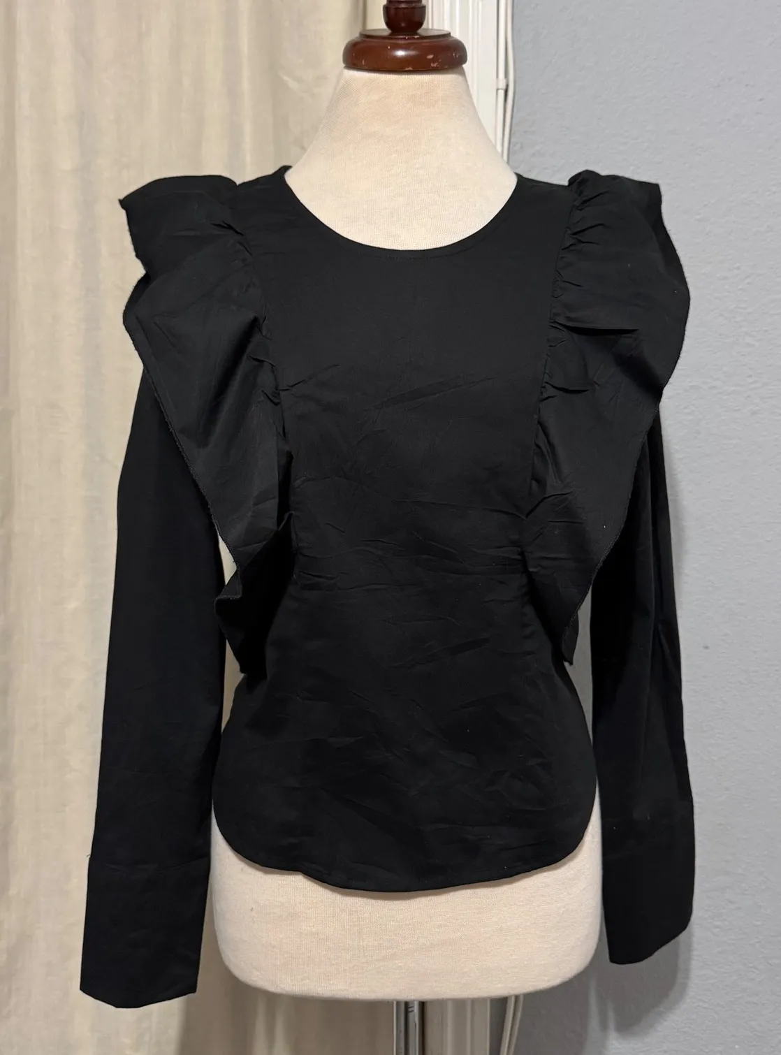 Drew black long sleeve top with dramatic ruffle shoulder detail. This stylish blouse features a flattering silhouette and a concealed back zipper closure. Perfect for a night out or a sophisticated office look. New with tags Measurements: • Bust: 18 in • Length: 23 in Type: Blouse Department: Women Style: Basic Material: Polyester, Spandex Neckline: Round Neck Sleeve Length: Long Sleeve Sleeve Type: Puff Sleeve Pattern: Solid Accents: Ruffle, Button Features: Shoulder Pads Fit: Slim Fabric Type: Woven Occasion: Casual, Party/Cocktail, Workwear Closure: Zip Keywords: Drew, ruffle top, statement sleeves, black blouse, long sleeve, chic, elegant, evening wear, workwear, fashionable, designer, modern