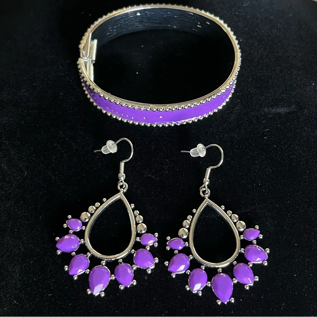 NEW Earrings and cuff bracelet matching Set, custom Jewelry, bright purple and silver tone metal En... Show more