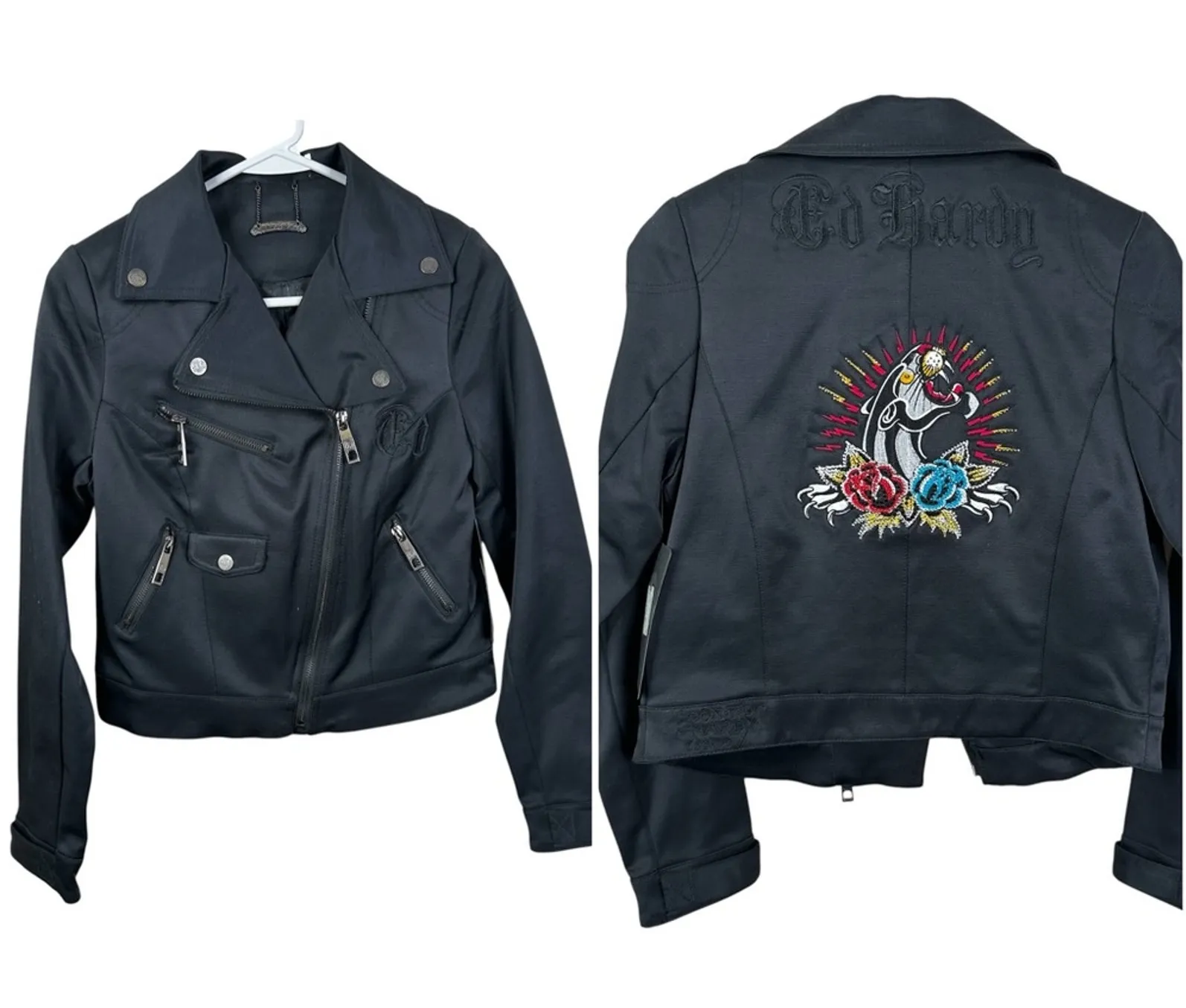 New with tag Polyester, viscose, spandex Zip up moto style Rhinestone bling art graphic on the back Measurements are approximate- Chest- 16" Length- 19.5" casual, moto, biker, 90s, Y2K, Christian Audigier, blingy, big cat, punk, embellished, grunge, emo