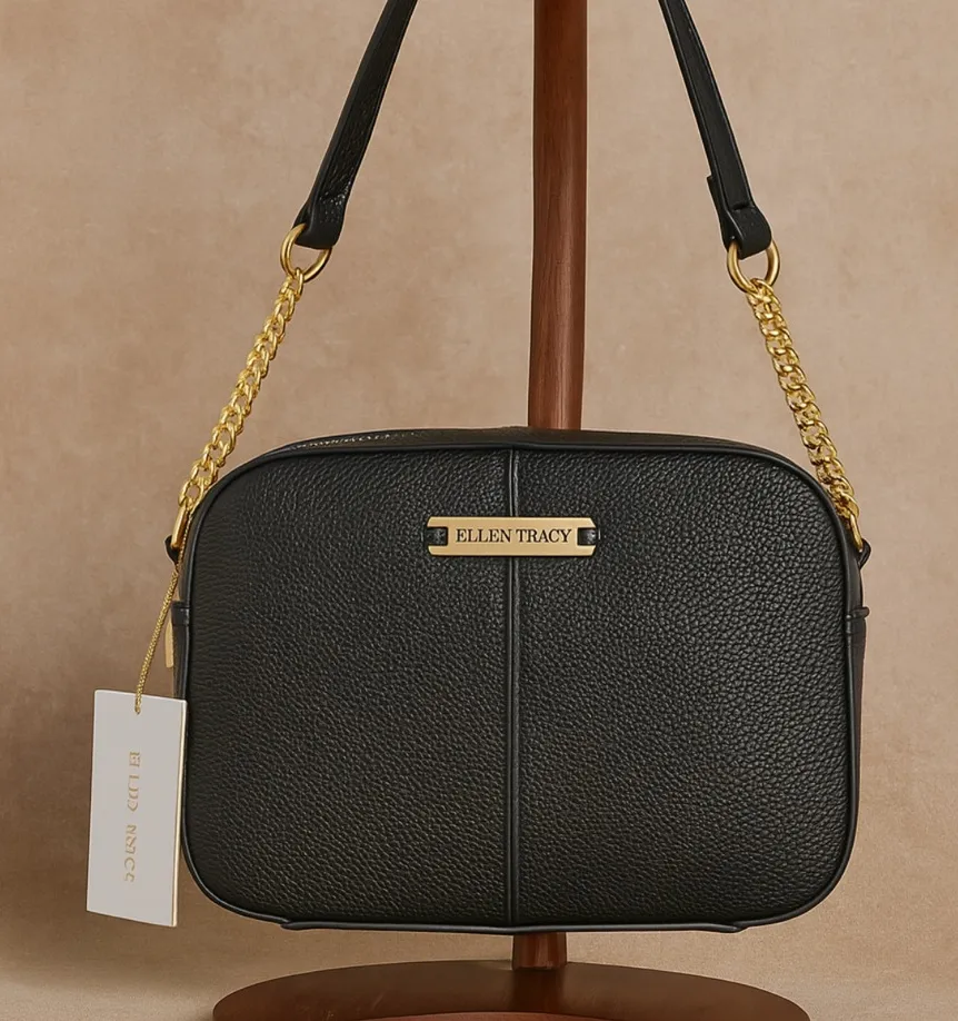 NEW Ellen Tracy Octavia Women's Black Pebbled Leather Gold Chain Crossbody Bag New With Tags!! Fr... Show more