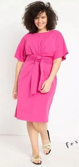 NEW Eloquii Pink Cross Front Flutter Sleeve Dress, size 20 New without tags Barbiecore, Barbie pink Pullover Medium weight stretch knit fabric Functional tie detail at the waist Model is 5'10", size 14 Length: 45 1/2" 94% Cotton / 6% Spandex Turn garment inside out. Machine wash on a cold gentle cycle with like colors. Use only non-chlorine bleach when needed. Do not tumble dry. Lay flat to dry. Cool iron as needed CN Item# 12378770040016 Color: pink Size 20, please check approximate laid flat measurements: Waist: 25 3/8'' Length (from high point of shoulder down): 44 1/2'' #406 Barbiecore, Barbie pink