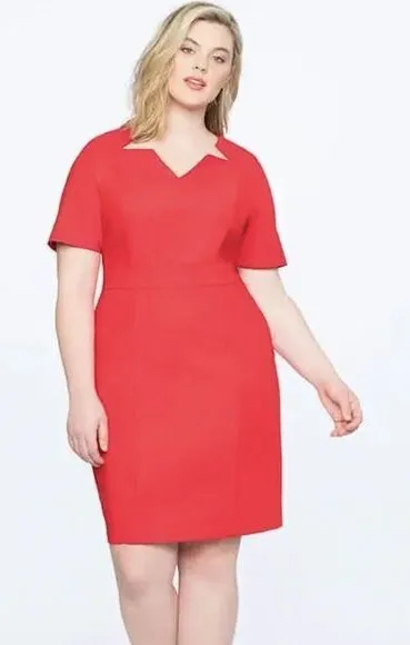 NEW Eloquii Sheath Dress with Cut Out star Neckline exposed zipper, size 18 New without tags Sheath Dress with Cut Out Neckline A thick, holds-you-in fabric and a sleek silhouette makes this style the perfect 30-second outfit for work, after work and more. Just add tights - or don't (we see you, Summer!) and voilà. Exposed back zipper Tailored fit Medium weight, non-stretch woven fabric 51% Cotton / 46% Nylon / 3% Spandex Color: red Size 18 , please check approximate laid flat measurements. Shoulder(seam to seam): 17'' Bust(armpit to armpit): 23 1/2'' Waist: 21'' Length (from high point of shoulder down): 42 1/4'' Measurements provided as a courtesy, not a guarantee of fit. Excellent condition. No noticeable flaws or stains or damages. 4645