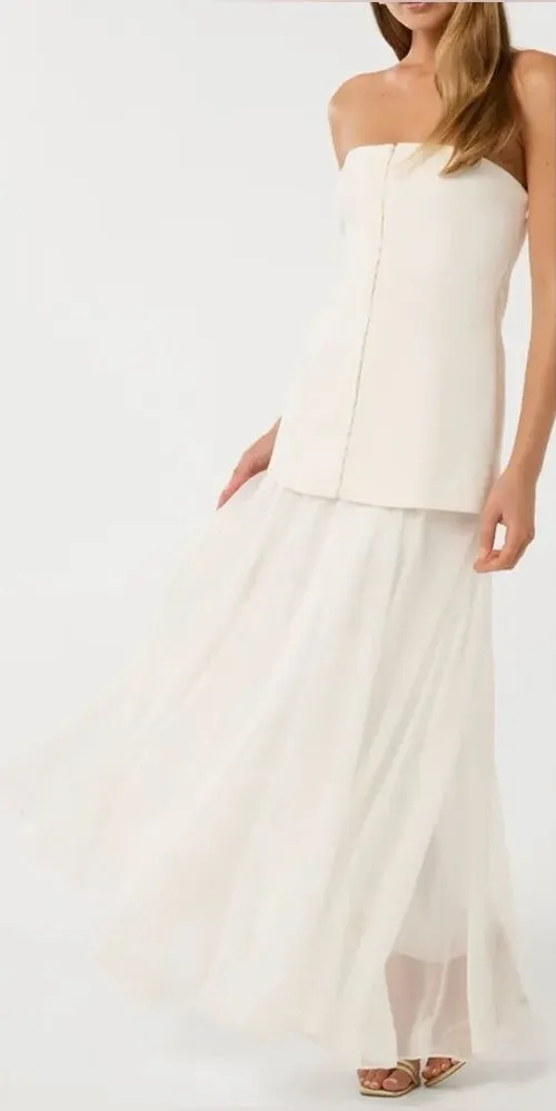 New without tags Size 10 Color ivory cream Achieve a two-piece look with whimsically elegant ease in a dress designed to read like a streamlined strapless vest paired with a frothy sheer skirt. Hidden side-zip; front hook-and-eye closure Strapless Lined 75% polyester, 18% viscose, 7% elastane bodice with 100% polyester skirt Hand wash, line dry Imported Item #10782952 Tags: Influencer Statement Piece, bridesmaids, black tie, gala, formal wear, prom, homecoming, pageant, wedding guest, bridal, wedding, bridal shower, mother of the bride, mother of the groom, rehearsal dinner, bachelorette, pageant, prom, homecoming, wedding, engagement photos, special occasion, little black dress, gala, Graduation, holiday parties, pageant, Quinceañera, formal, black tie, cocktail, Maid of honor, Special occasion, Designer Event, Dinner gown, Photo shoot, Formal event, Celebrity Red Carpet Luxe Luxury, Holiday, Vacation Resort wear, Beach dress, Spring, Summer, Fall, Winter, viral