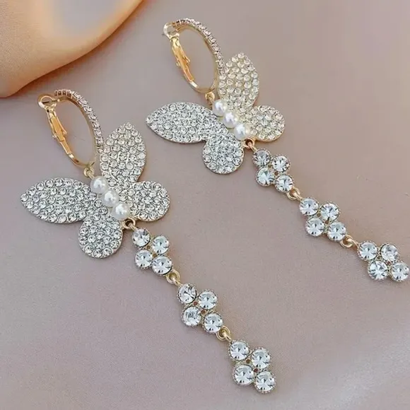 New! Exquisite Butterfly Earrings With Full Shiny Rhinestone Faux Pearl Decor Gold - $15 - From Nayab