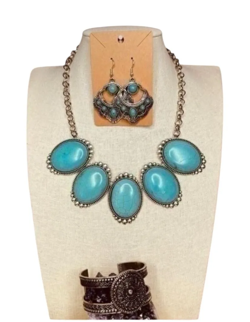 New Fashion Jewelry Southwest Faux Turquoise Statement Necklace, Earrings & Bracelet Set. Necklace l... Show more