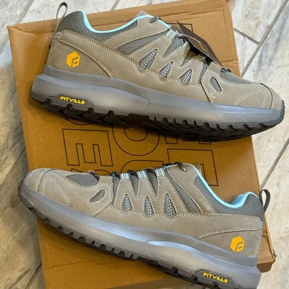 FitVille Women's size 10 wide Low-Top Sturdy Core Hiking Shoes V3 *Wide Width: Comfort fit for wide feet, bunions, arthritis and hammer toes. *Surefooted & Comfortable: Rubber sole for superior traction and durability, EVA midsole for day-long comfort. *Zero Break-In Time: Silky lining & cushioned collar for a sock-like fit right out of the box. *Arch support & Relief: U-shaped insole for balanced pressure and immediate foot pain ease. *Breathable & Tough: Synthetic leather and nylon mesh uppers for lasting outdoor protection. Color: Sage Khaki with Coastal Mist NEW IN BOX! MSRP $82.00 No Smoking/Pets