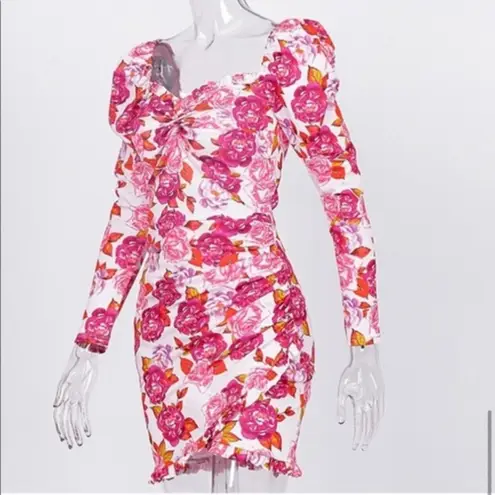 NEW Boutique Floral Mini Dress XS/S Pink Elegant - new in package, boutique/custom mini Demi dress - pattern: floral, color; pink, white, orange. This is the perfect glam mini dress. Material is smooth unlike the photo looks stiff, it is stretchy, and shoulders can be puffed if desired. They do not have to be! FIRM unless bundled. Tag S but check the chart it can also fit XS, or medium just in! VERY STRETCHY & WELLMADE. Ruffled split hem. Breathable, multi season dress. 95% Polyester 5% Spandex.