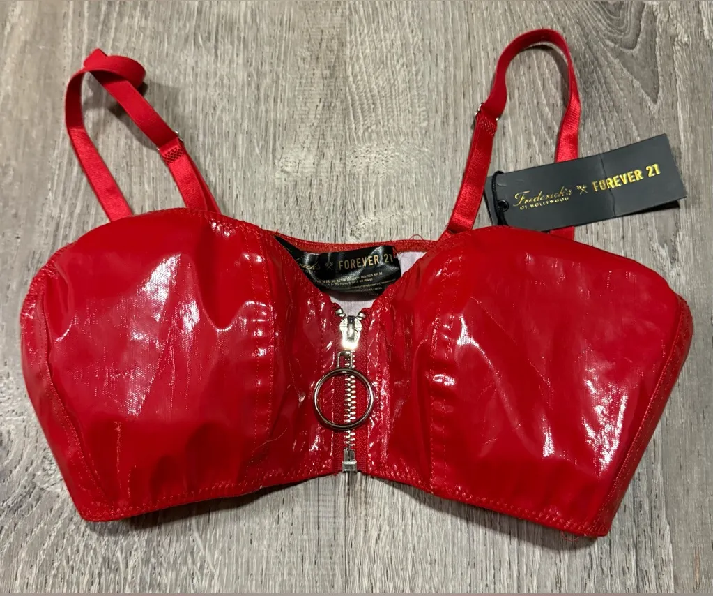 Description: Turn heads with this new Frederick’s of Hollywood x Forever 21 red vinyl rave bra, desi... Show more