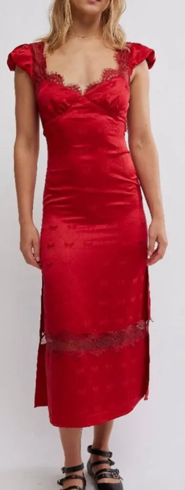 Make a festive and flirty statement in this satin sheath dress featuring a tonal bow pattern and scalloped lace trim.