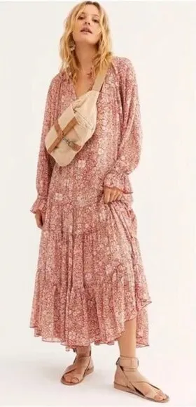 New! Free People Red Floral Print Bohemian Feeling Groovy Ruffle Maxi Dress, size S Please note: no... Show more
