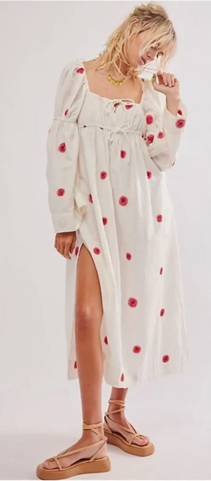 Womens Size Small Dress Ivory Red Square Neckline Midi Length Cotton Linen Blend Tie Front Detail R... Show more