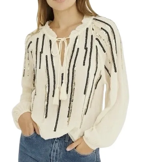 Free the Roses metallic sequin long sleeve tie neck blouse. Pullover. Ruffle trim around the neckline. Split neck with tassel ties. Raglan long sleeves with elastic cuffs. Lightweight crinkle gauze fabric with subtle gold metallic stripes. Black and gold sequins cascade down the top half of the body on the front. Unlined. Material: 99% rayon 1% metallic yarn (exclusive of decoration). Brand: Free The Roses Style: SY556T Color: White Size: M medium Condition: NWT new with tags. Comes with some extra sequins. Approximate measurements laying flat: Pit to pit 19" Length 24" Style: Nordstrom, Sparkly, Sparkle, Shimmer, Shiny, Boho, Bohemian, Flowy, Glam, Glamorous, Luxe, Night Out, Going Out Tops, Party, Pretty Shirt, Holidays, Fall, Autumn, Winter, Thanksgiving, Christmas, New Years, Champagne