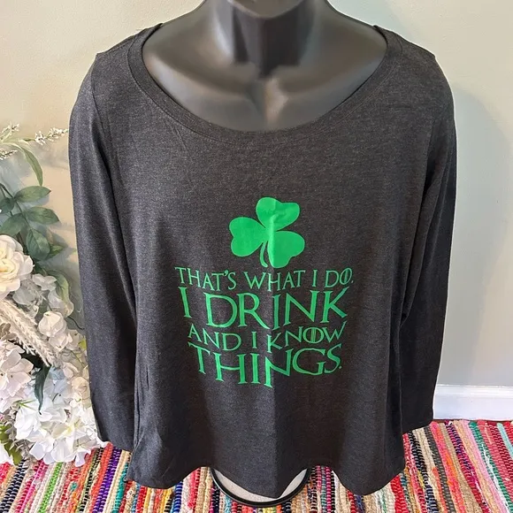 NEW Game Of Thrones Tyrion I Drink And I Know Things T-Shirt Irish lucky clover at the top. Perfect for Saint Patrick's Day, St. Patty's Day, St. Paddy's Day Parade, Boston, Irish Day, New York City, NYC, Shamrock, Beer Mug. Drinking, drunk, alcohol, liquor, house party, Winterfell, Lannister, GoT Size: XL, Extra Large Chest: 19.5" Length: 27" Color: Dark Gray, Grey Condition: NWT New with tags