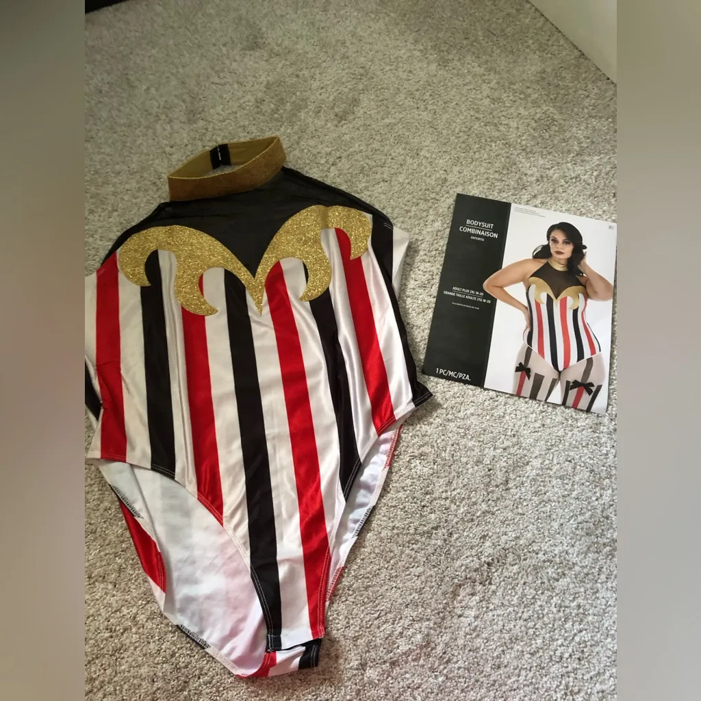 New Halloween Adult women Costume plus sz 2XL 18/20 Striped Bodysuit clown 1 pc, new in the bag Eye-catching bodysuit with red, black, and white stripes. Features gold accents for a bold look.