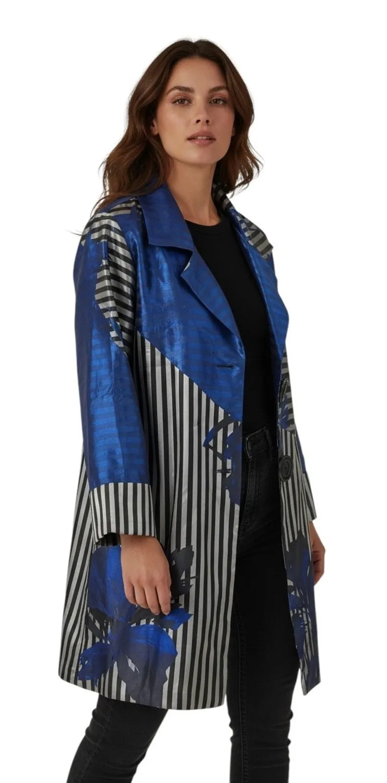 This item is brand new with tags attached Long sleeve Blue,black and silver Striped & abstract floral print Button front Collared neckline Made in USA Length - 35" Across chest - 27" Model image was created using an AI tool for styling reference. Trusted seller; ships quickly Packaged with care Ships from a smoke-free and pet-free envionment