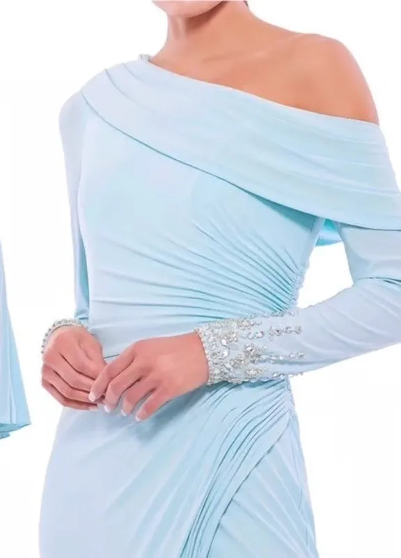 . New with tags. No issues. Embellished with collected ruffles this midi length dress features a one shoulder neckline with long sleeves in precious stones. The skirt opens on all legs with a high slit. Zipper Back Length : Midi Length Sleeve Style : Long Sleeve