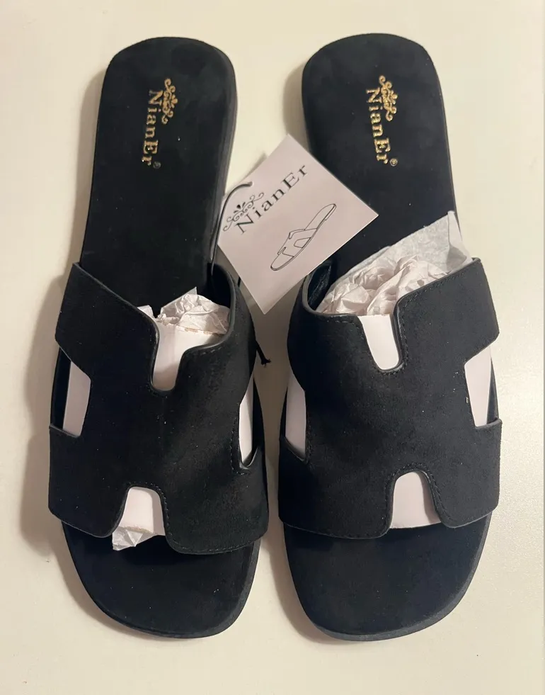 Brand new with tags NianEr black slide sandals featuring a soft suede-like upper and an easy slip-on design. Clean, minimal look that works great for everyday wear, travel, or casual outfits. Flat sole makes them comfortable and easy to wear. Size: Women’s US 11 • Tag shows: US 11 / EU 42 / UK 9.5 • Foot length noted on tag: approx. 26.7–27.2 cm Condition: New with tags (never worn) Color: Black Style: Flat slide sandal Materials: Upper: Silky suede leather Insole: Waterproof MDF with latex & microfiber leather (designed to feel like genuine leather) Outsole: TPR (thermoplastic rubber) From a smoke-free home. Fast shipper! I strive to give buyers a great experience—if there are any issues, please reach out and I’ll make it right. Bundle items to save. Shoes may arrive with light handling marks from storage or shipping. SH 23