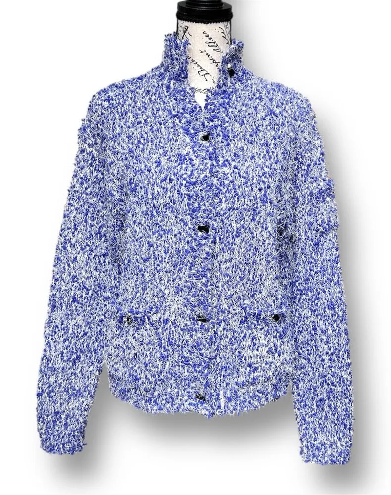 Description: New with tags Jamie Sadock “Electra” cardigan sweater in a bold blue and white boucle chunky knit. Features a mock neck, button front, front pockets, and unique sleeve pocket. A retro Y2K sporty-chic style perfect for resort, golf, or casual wear. Occasion: Golf Resort, Tennis, Travel, Weekend Casual, Retro Streetwear, Fall Winter Layering Accents: Mock Neck, Button Front, Boucle Knit, Front Pockets, Sleeve Pocket, Textured Yarn Features: New with tags Jamie Sadock “Electra” style Unique boucle chunky knit texture Bold cobalt blue and white marled design Mock neck for a sporty-polished look Button-front closure for versatile wear Two front pockets + sleeve pocket for functionality Comfortable cotton blend Measurements Flat (approx.): Underarm to Underarm: 22" Shoulder to Hem: 24" Material: 52% Polyester, 42% Nylon, 8% Cotton Condition: New with tags Stored in climate-controlled, smoke-free, pet-free space.