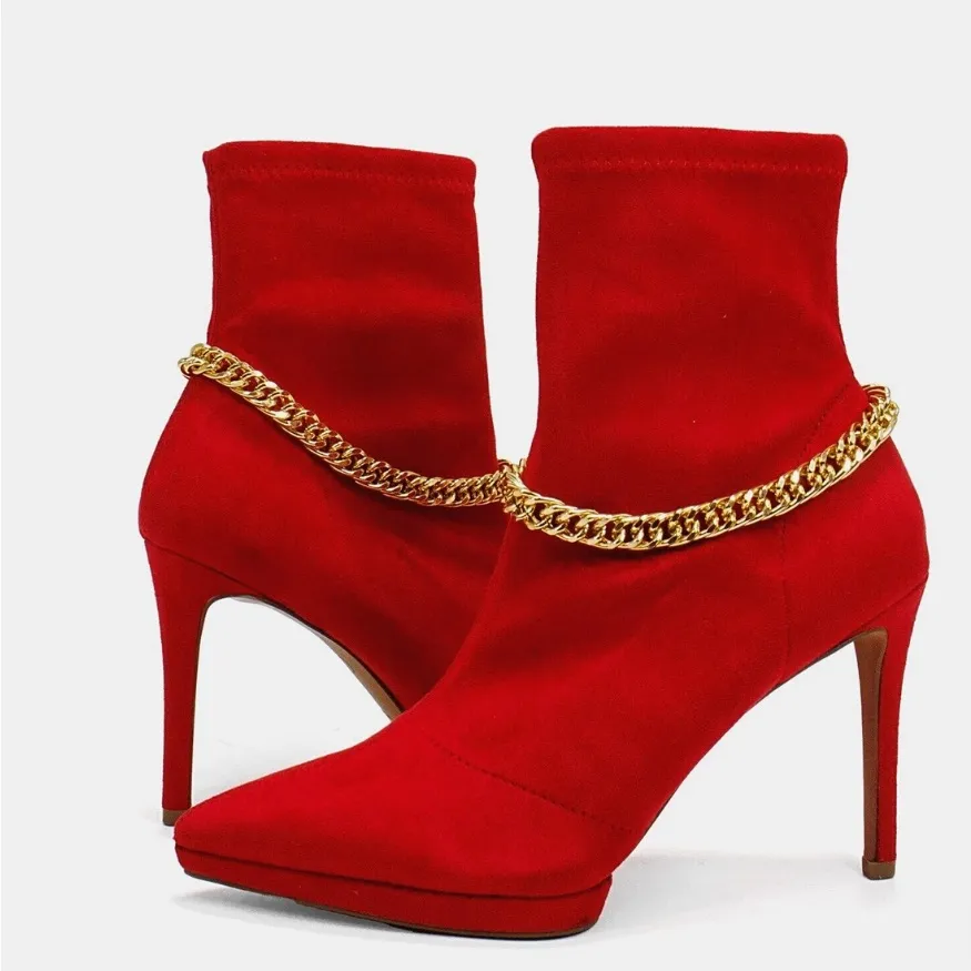 New Bold red boots with sleek stiletto heels. Faux suede with gold chain accent adds elegance. Perfe... Show more