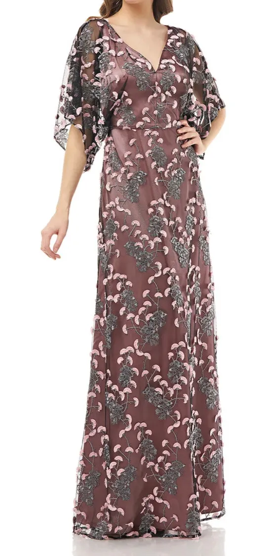 New with tag. JS Collections Embroidered V Neck Dress Blush multi floral floor length gown. Size 10. Cocktail dress features kimono sleeves. Blush pink underlay with black embroidered mesh overlay. Features in V-neckline and kimono sleeves, this magnificent dress highlights the allover embroidered detail. The dress falls in floor length with a straight silhouette. Feminine, bold, and imperial, this gown from JS Collections will definitely make you shine! Perfect for special events, parties, mother of the bride (MOB) or grooms mother. MSRP $445
