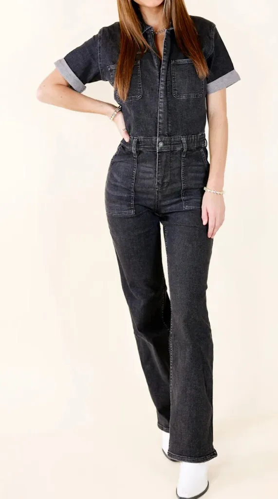 Make a stylish statement with this Judy Blue jumpsuit! Boasting cuffed short sleeves, a collared neckline, and zip up front, this black denim number will keep you looking chic and comfortable. The straight leg is perfect for a casual day out or dress it up for a night on the town - the versatile look will always be on trend. Fabric Content: 92% Cotton 7% Polyester 1% Spandex Care Instructions: Hand wash, cold. Do not bleach. Hang to dry.
