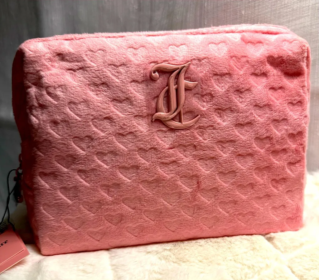 New Juicy Couture Travel Cosmetics bag in pastel pink felt with metallic gold logo. Features a uniqu... Show more