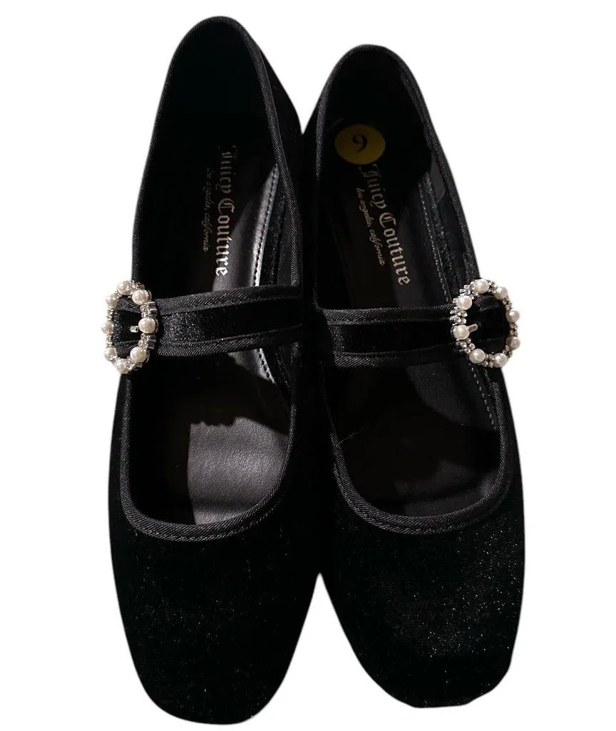 The product is a pair of Juicy Couture black Mary Jane flats for women. The shoes feature a velvety... Show more