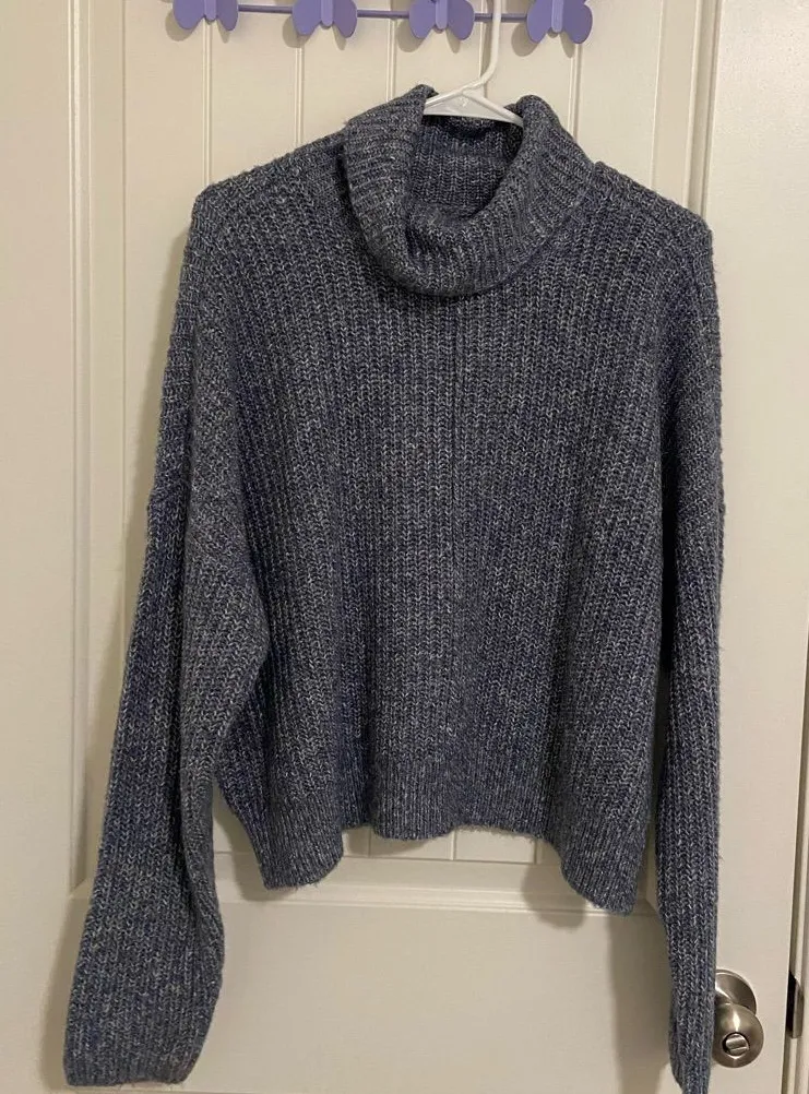 Women’s Lucky Brand sweater. Sweater is made of blue and white thick knit material. Has a cowl neck.... Show more