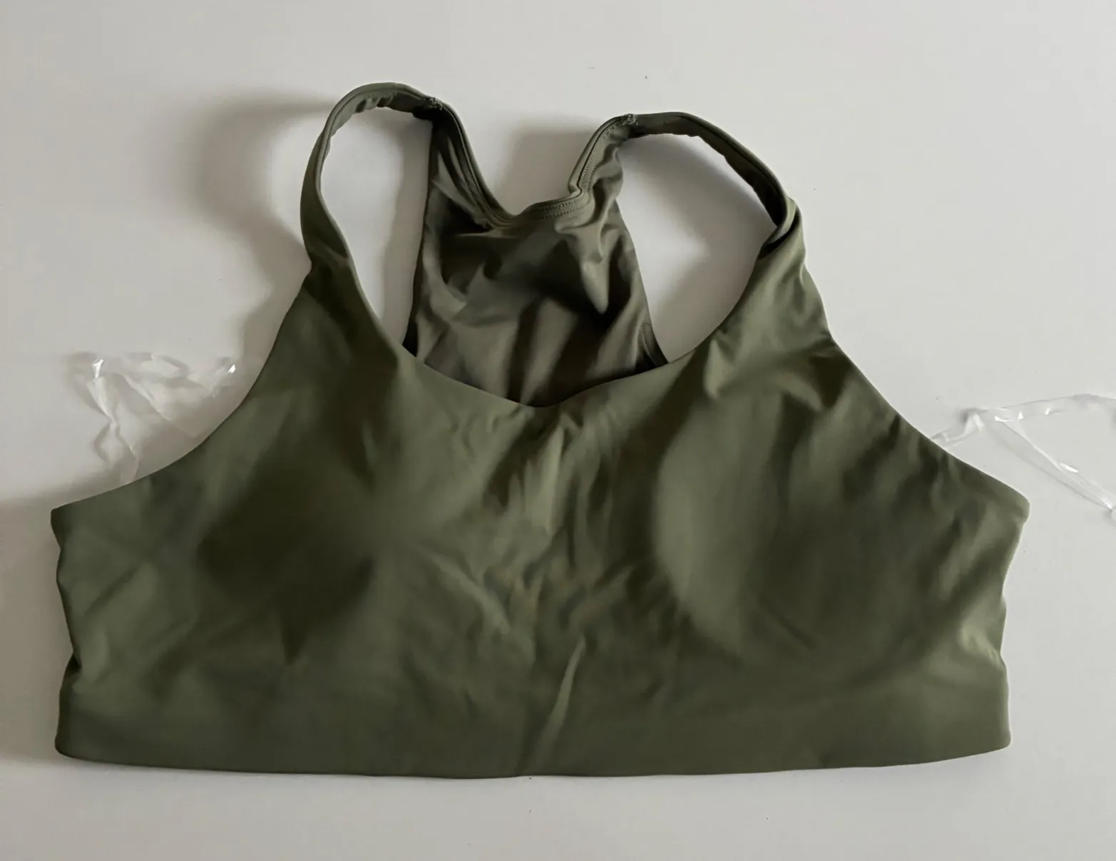 Keywords: Lululemon sports bra, Nulux fabric, strappy back, olive green, high support, medium support, moisture wicking, quick dry, athletic wear, workout top, yoga bra, activewear, racerback, performance