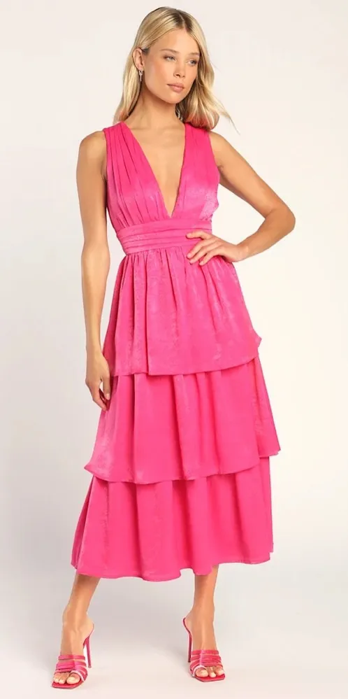 Be the best dressed at your next soiree in the Lulus Peak Party Vibe Hot Pink Satin Tiered Tie-Back... Show more