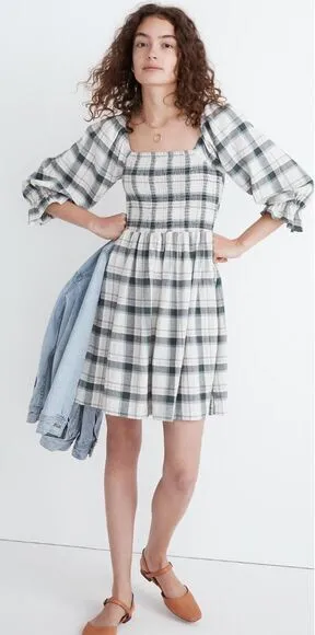 NEW Madewell Lucie Elbow-Sleeve Smocked Mini Dress in Lebaum Plaid, M The prettiest way to be comfy... Show more