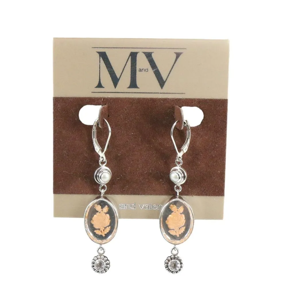 New Mars and Valentine Vintage Sterling Silver Pearl Rose Crystal Dangle Earrings Beautiful dangle earrings with a pearl, rose behind glass oval and a crystal. Sterling silver Leverback For pierced ears At certain angles in the light, you can see tiny scratches on the backs of the ovals. See last picture. New, on card with Nordstrom sticker in velvet Nordstrom pouch! Approx. Measurements: 2.5" total length