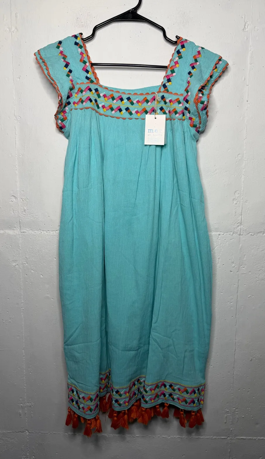 Womens Size Large Mer St. Barth Sandrine Square-Neck Tassel Midi Dress in the "Sea Mist" or "Turquoise & Orange" colorway. It is made of 100% cotton crepe and features colorful embroidery and orange tassels at the hem brand new with tags