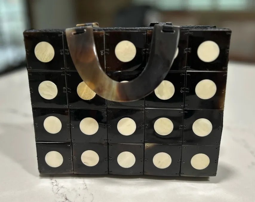 NEW Mid Century Mod In laid Mother Pearl Horn Lined Clutch 8x6” Tico Collection Vintage Mod Lucite Handbag – brown with Mother of Pearl Accents and horn squares Turn heads with this handbag made from glossy black lucite squares featuring inlaid mother of pearl dots. The bag has a unique geometric grid design with an open rectangular handle in a stunning tortoiseshell-style finish. Lightweight yet sturdy, this piece is perfect for mid-century lovers or mod fashion, and ideal for making a statement at parties or events. Details: • Approx. 8” W x 6” H (excluding handle) • Hard shell construction • Snap closure • Lined • Interior zippered pocket Add a retro pop to your wardrobe or display as part of your vintage collection!