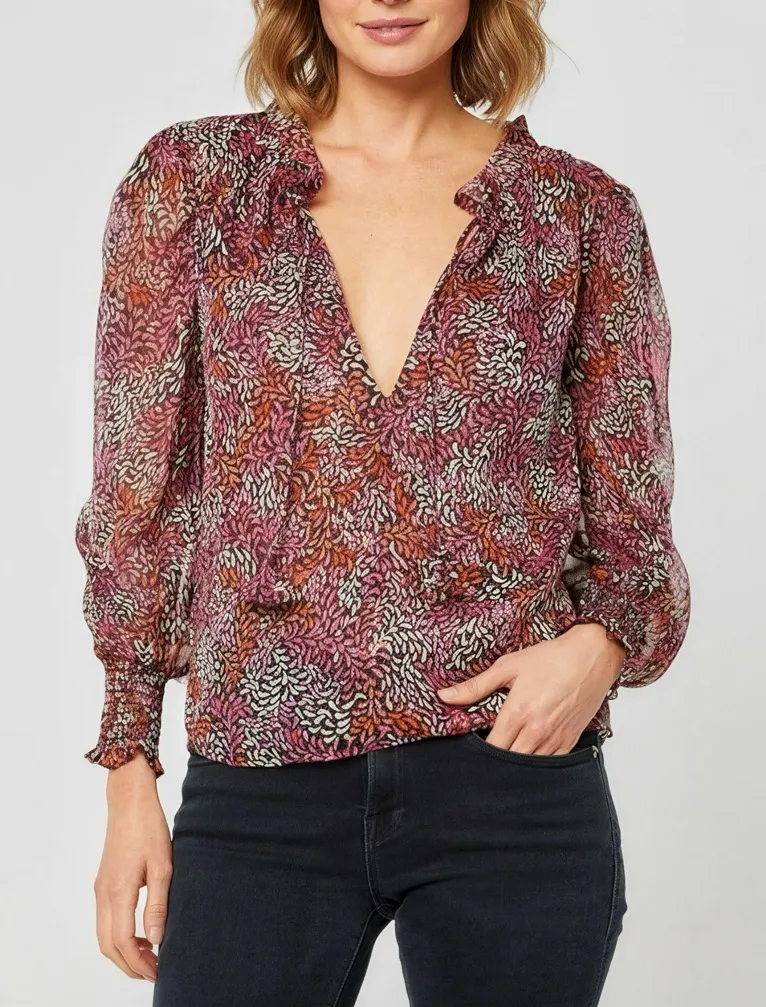 - New, No Tags, No Flaws - Top only - Orig: $275 - Rich floral chiffon print - Split-tie neckline - Ruffle trim - Petal ties - Long semi-sheer sleeves - Wide, smocked elastic cuffs - 100% Poly Chiffon Approx. Measurements: - Size: XS - Bust: 38” - Length: 22” Actual item for sale is shown using a mannequin. For sizing reference, our mannequin’s measurements: Bust: 35.5” | Waist: 26.5” | Hips: 38.5” | Height: 5’11