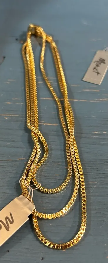 Chic layered design. Gleaming gold finish. Versatile style. The gold necklace in the image is a box chain style, also commonly referred to as a square link chain or Venetian chain. The design features interconnected square links that create a smooth, continuous look. The tag visible in the image identifies the brand as Monet. Made in Korea. #20538