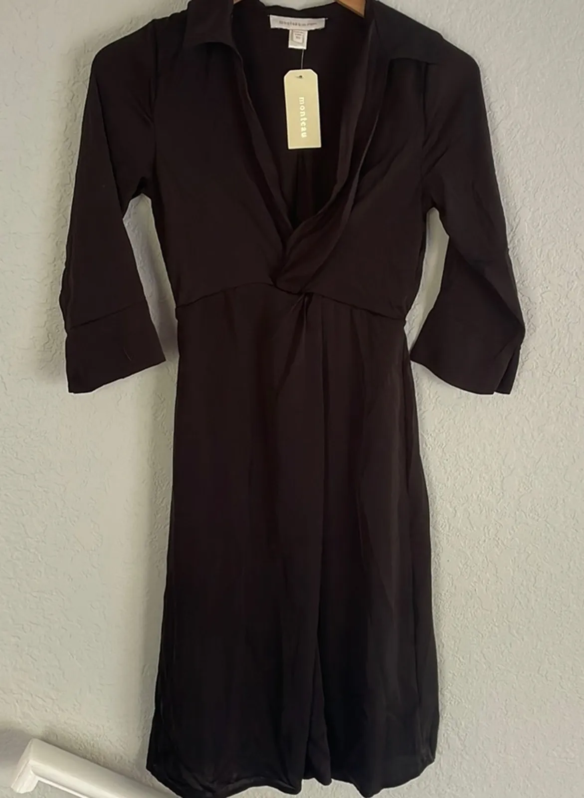 Monteau Black Dress with Surplice front Size XS Length 37.5” Pit to pit 16.5” flat 3/4 length sleev... Show more