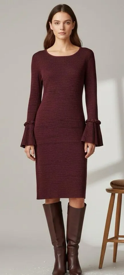 New Nina Leonard Bell Sleeve Sweater Dress Wine Burgundy Ribbed Knit Sz L Gorgeous wine-colored sweater dress with trendy bell sleeves! Soft ribbed knit fabric with elegant pleated cuffs. Perfect for winter gatherings, date night, or holiday dinner. Brand: Nina Leonard Size: Large Color: Wine Multi Condition: NWT Material: Rayon/Poly blend Flattering fit, hits below knee. This dress is a showstopper! Fitted Dress ∙ Midi Dress ∙ Bell Sleeve ∙ Flare Sleeve ∙ Statement Sleeve ∙ Trumpet Sleeve ∙ Ruffle Cuff Aesthetic/Vibe: ∙ Boho Chic ∙ Romantic ∙ Feminine ∙ Elegant Casual ∙ Date Night ∙ Party Dress ∙ Cocktail Dress