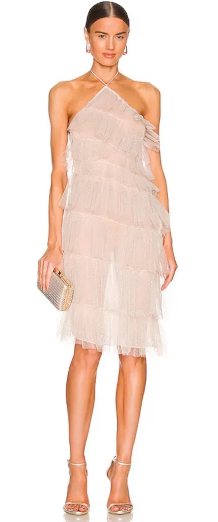 is an absolute statement piece! This cream midi dress features a halter neckline, an asymmetrical hem and layers of tiered tulle. Sparkle throughout. Side zip closure. Self 100% nylon. Lining 100% silk. Made in the USA! Revolve Style No. TBAR-WD33 Manufacturer Style No. DR009 Approximate Measurements Length: 41” shoulder to longest part of hem Pit to pit: 16” measured flat TAGS: Designer, Shopbop, Revolve, Tulle, Tier, Tiered, Midi Dress, Halter, Silk, Balletcore, Barbie, Barbiecore, Girly, Feminine, Casual, Dressy, Classic, Trendy, Spring, Summer, Travel, Vacation, Holiday, Resort, Cocktail, Party, Event, Baby Shower, Bridal Shower, Date Night, Girls Night Out, Birthday Party, Formal, Bloggers Fav, Bloggers Favorite, Influencers Favorite, Asymmetrical, Bridal, Wedding, Bride To Be, Engagement Party, Engagement Photos, Bridal Shower, Bachelorette Party, Rehearsal Dinner, Reception Dress, Honeymoon O13