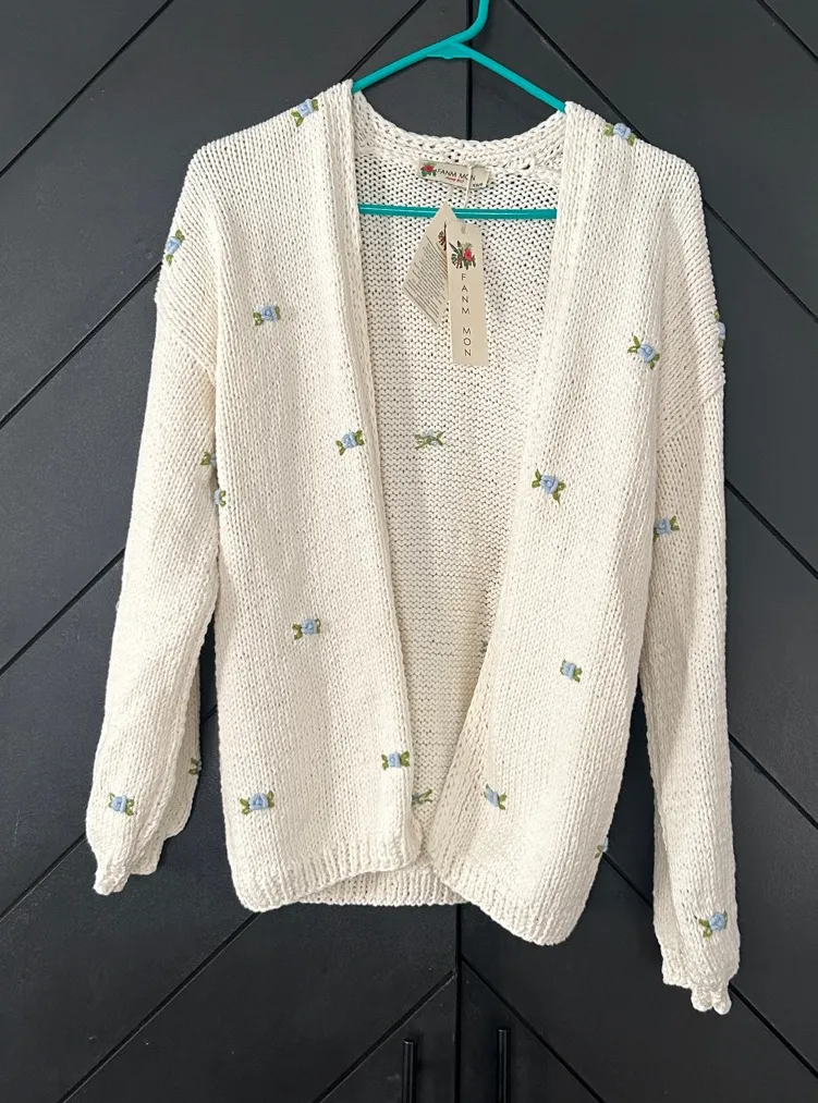 Hand-knit and hand-embroidered rose floral cardigan made with 100% organic cotton and natural dyes. Perfect to wear nearly year-round. Quality is top notch! Beautiful piece! 100% Organic Cotton Cardigan Sweater Handcrafted from organic cotton and natural dyes by a collective of stay-at-home mothers and caretakers in Istanbul, Turkey. Features All-Over Floral Inspired Embroidered in Light Blue and Green (on front and back) Easygoing Open Cardigan Style Length: 66 cm (26'') Sleeve Length 58 cm (23'')