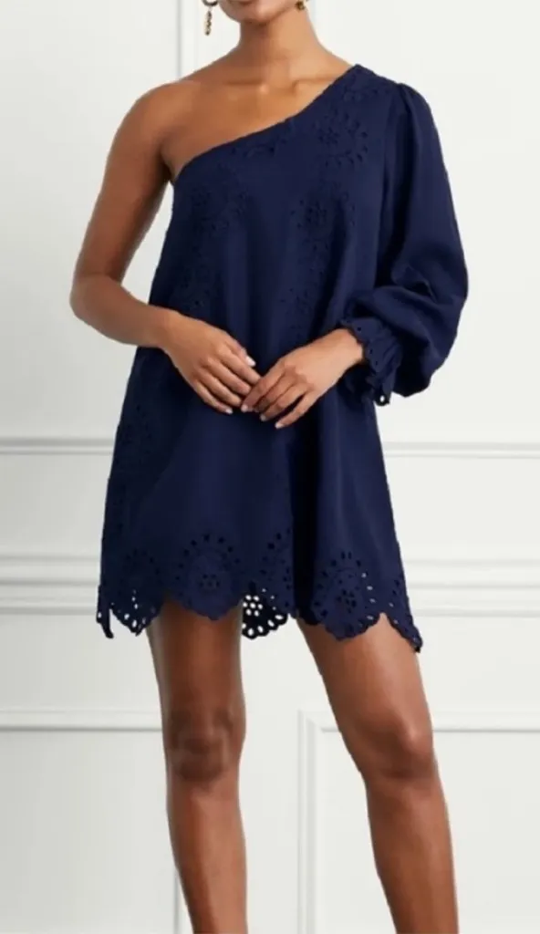 is such a gorgeous piece! This one shoulder dress has one long sleeve. Eyelet details with scalloped... Show more