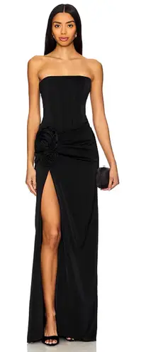 is an absolute statement! This strapless gown features a boned bodice and a draped fabric skirt with 3D floral accent. High slit design. Back zip closure. Self 96% polyester, 4% elastane. Lining 97% cotton, 3% elastane
