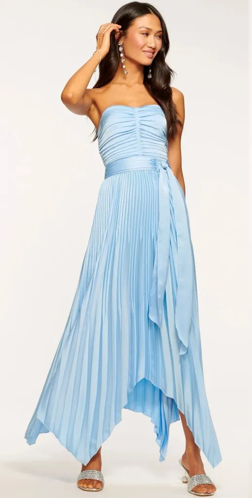 is perfect for your next event! This light blue satin dress features a strapless style with pleating throughout. Asymmetrical hem. Smocked back panel for the perfect fit. Side zip closure. 100% polyester. Lining 96% polyester, 4% spandex. STYLE # A04233009 Approximate Measurements Length: 55” top of bust to longest part of hem Pit to pit: 16” measured flat (stretches larger because of smocking) Waist: 13.5” measured flat TAGS: Designer, Shopbop, Revolve, Strapless, Midi, Maxi, Asymmetrical, Pleating, Pleated, Satin, Casual, Dressy, Formal, Classic, Trendy, Spring, Summer, Fall, Winter, Travel, Vacation, Holiday, Resort, Date Night, Girls Night Out, Wedding Guest, Cocktail, Party, Event, Bridesmaid, Smocked, Smocking, Pastel, Baby Blue C2