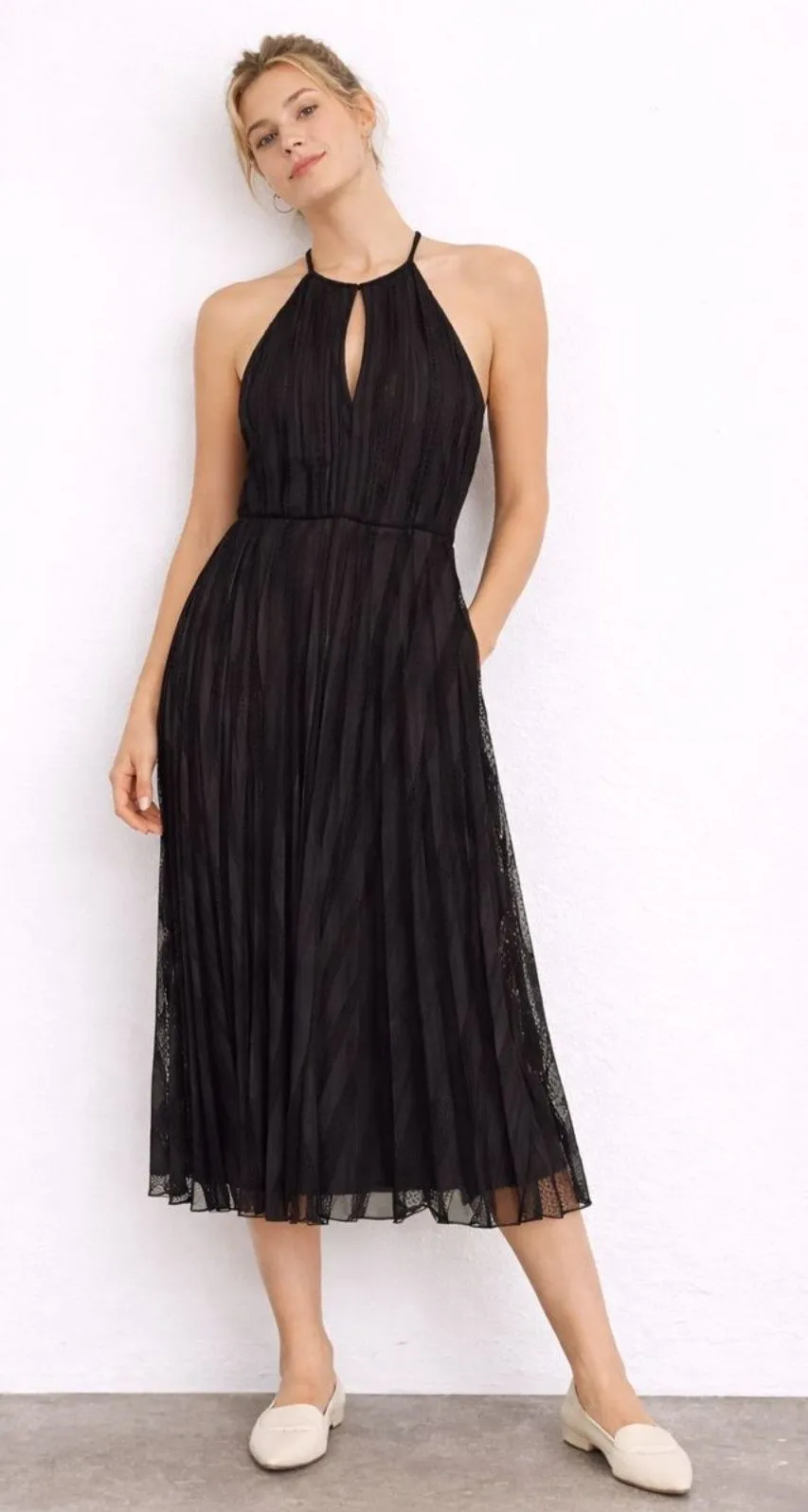Black sleeveless midi dress High neck, keyhole opening on front Lined 100% poly NEW WITH TAGS Size 6... Show more