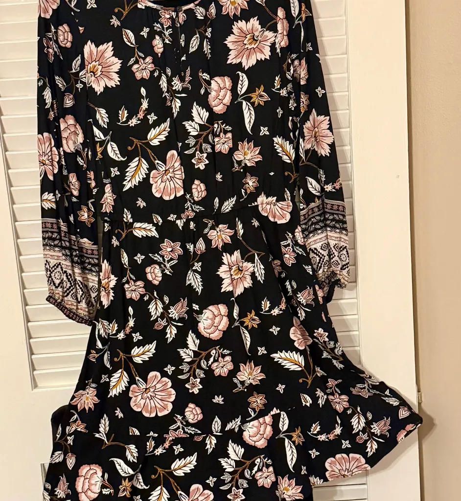 Black cotton blend dress with a charming boho pink, gold & white boho floral print, long flowy ballo... Show more
