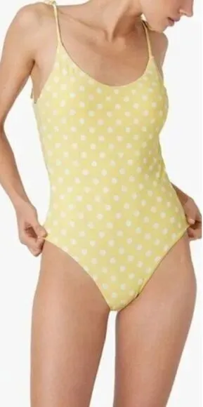 NEW Onia Polka Dot Sunshine Yellow Ginny One Piece Swimsuit, size L New without tags. A streamlining maillot with delicate finishes, Ginny flatters the figure with a scooped neckline countered by a deeply low-cut back. An inner shelf bra provides support, while string ties allow you to adjust tension at the shoulders ensuring the most comfortable fit. - Scooped neckline - Low-cut back - Inner shelf bra - Removable, padded cups - Adjustable string ties - 85% Nylon 15% Spandex vacation beach tan sun trendy instagram blogger summer spring Boho hippie 60’s 90’s 70’s beachy western pool coachella festival birthday gift resort bohemian vacation revolve zara dressy office work sexy contemporary office preppy The measurements shown are approximate and are provided as a helpful reference, but not a guarantee of fit. The actual colors may vary due to differences in lighting conditions and computer monitor settings. Please note: stock photos are provided for fit and style reference only.