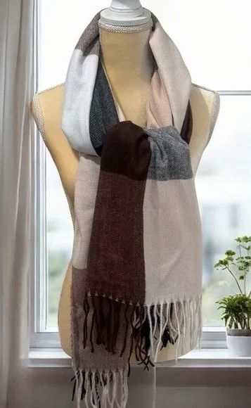 NEW Pashmina Neutral Colored Checkered Fringe 100% Cashmere Scarf Size 27x64 - $40 New With Tags - From Casey