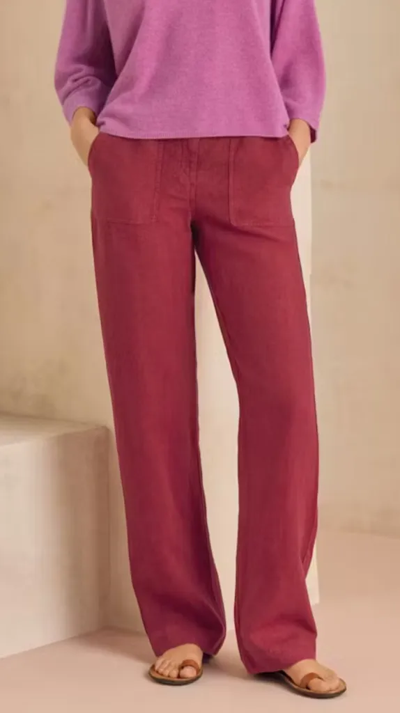 New with tags! A great pair of heavier-weight garment-dyed and laundered linen straight-leg trousers. The deep waistband has an internal tie closure for a neat fit and fastens with a trio of corozo buttons. With essential pockets at the front and back 100% linen, Trim 100% cotton Machine wash Heavy weight linen, garment-dyed and laundered Relaxed straight-leg trousers Full length Deep waistband with internal channel and tie on the inside Triple corozo button waist fastening Metal zip fly fastening Patch-pockets with angled opening Patch-pockets on the back Darts at the back from the waistband Deep hem finish Inseam 31” Vacation, travel, cruise, resortwear