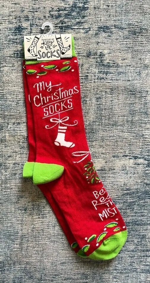Primitives by Kathy Red Green My Christmas Socks 1 Pair One Size Red and green holiday themed socks from Primitives by Kathy. Has "My Christmas Socks" and "Better Results Than Mistletoe" written on them with a picture under socks mistletoe. 65% Cotton, 33% Nylon, 2% Spandex Machine wash in warm or cold water. One Size Fits Most D